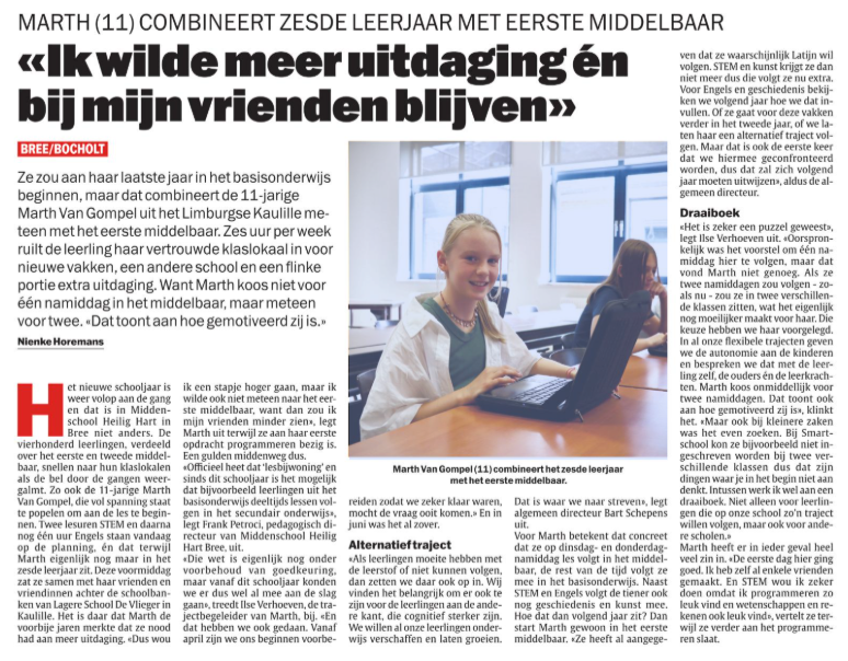 Cognitief sterk functionerende leerlingen uit het basisonderwijs kunnen een individueel traject volgen in onze middenschool. De 11-jarige Marth Van Gompel is zo een leerling die de spits mag afbijten in onze school als eerste "springer". Zij zit in het zesde leerjaar in Bocholt, maar twee halve dagen volgt ze les