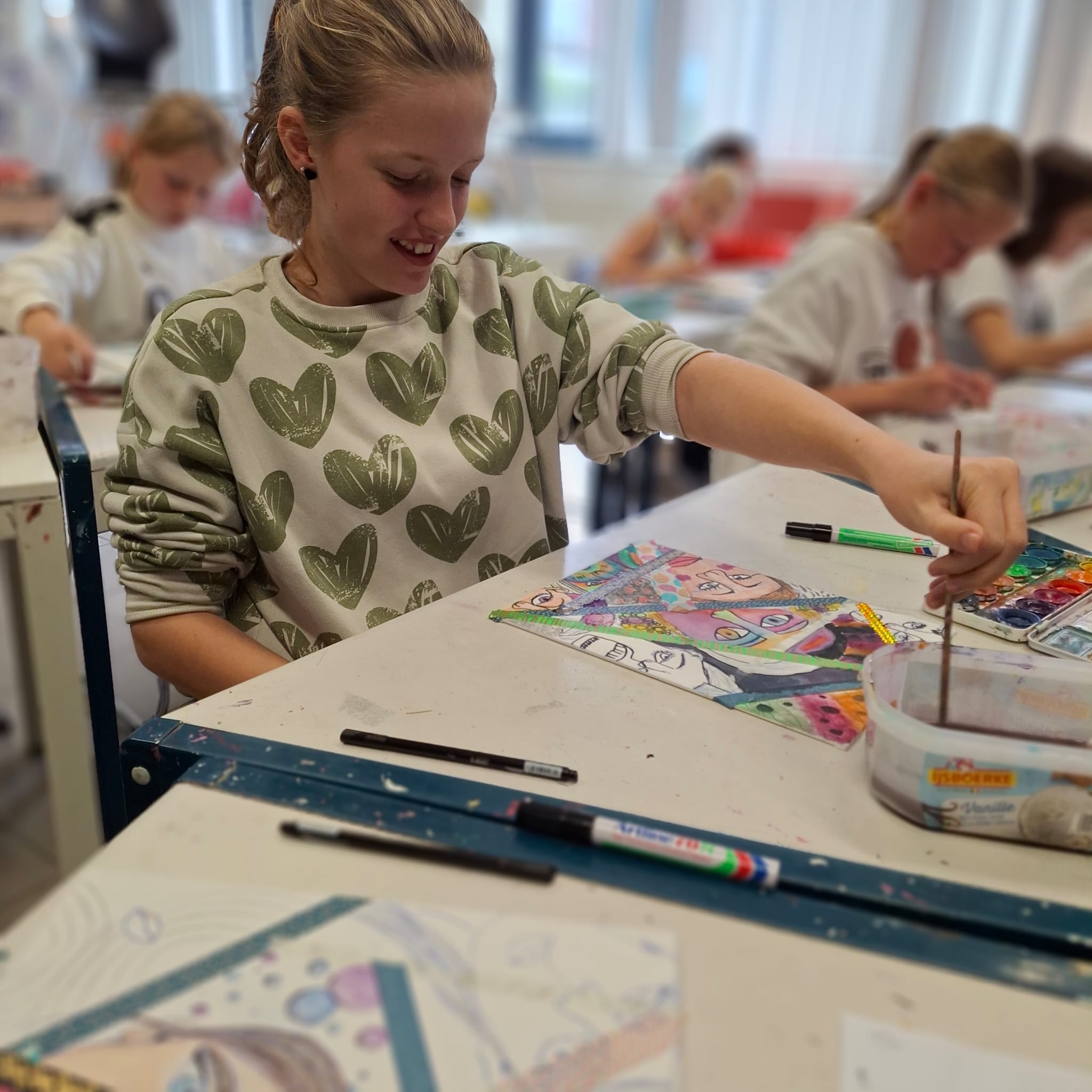 Tijdens het Talentenuur Kunstatelier werkten de leerlingen afgelopen lessen met verschillende materialen: van dunne pennetjes, kleurtjes tot aquarel. Hiermee maakten ze lineaire portretten en patronen.