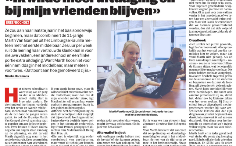 september 24, 2025Cognitief sterk functionerende leerlingen uit het basisonderwijs kunnen een individueel traject volgen in onze middenschool. De 11-jarige Marth Van Gompel is zo een leerling die de spits mag afbijten in onze school als eerste “springer”. Zij zit in het zesde leerjaar in Bocholt, maar twee halve dagen volgt ze les in het eerste jaar. Het doel is om haar uit te dagen, omdat ze een leervoorsprong heeft op haar leeftijdsgenoten.